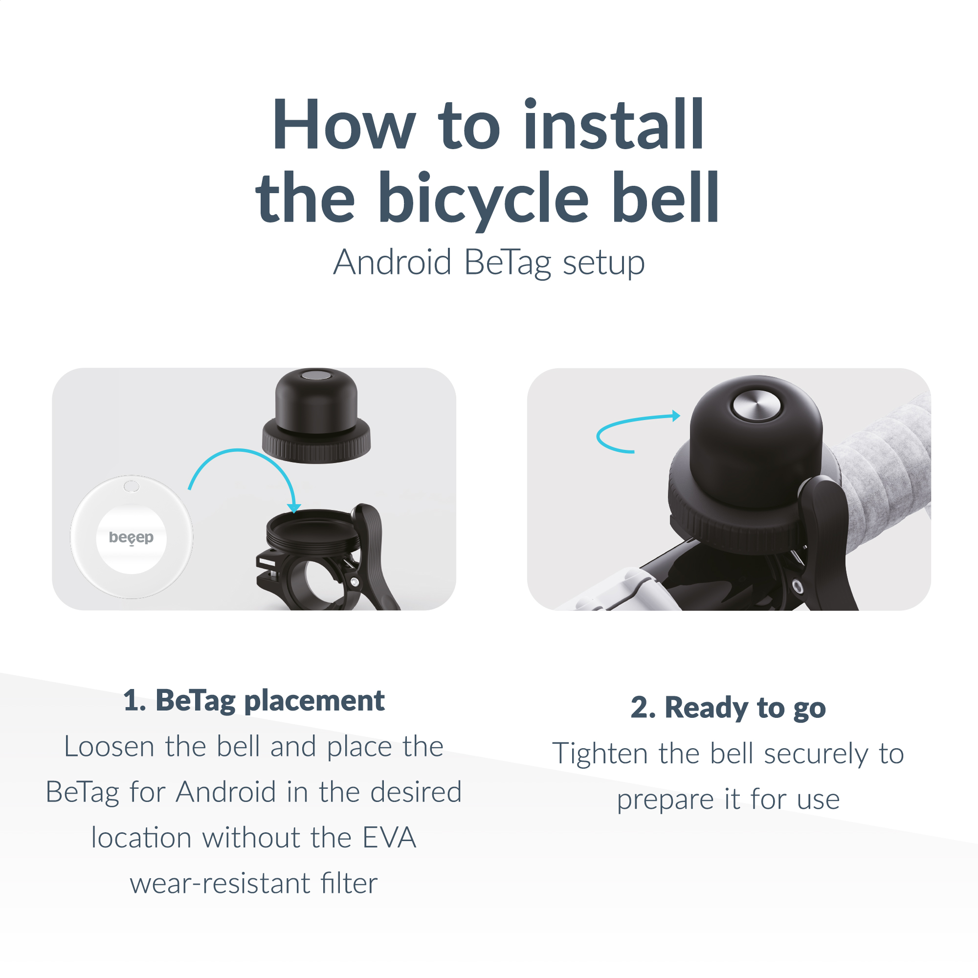De fietsbel beschikt over een slim schroefmechanisme, waarmee je de bovenkant eenvoudig kunt openen om de meegeleverde Beeep BeTag Android Tracker veilig te plaatsen. Omdat de tracker volledig uit het zicht blijft, is deze nauwelijks te detecteren en helpt hij je fiets discreet te beveiligen.