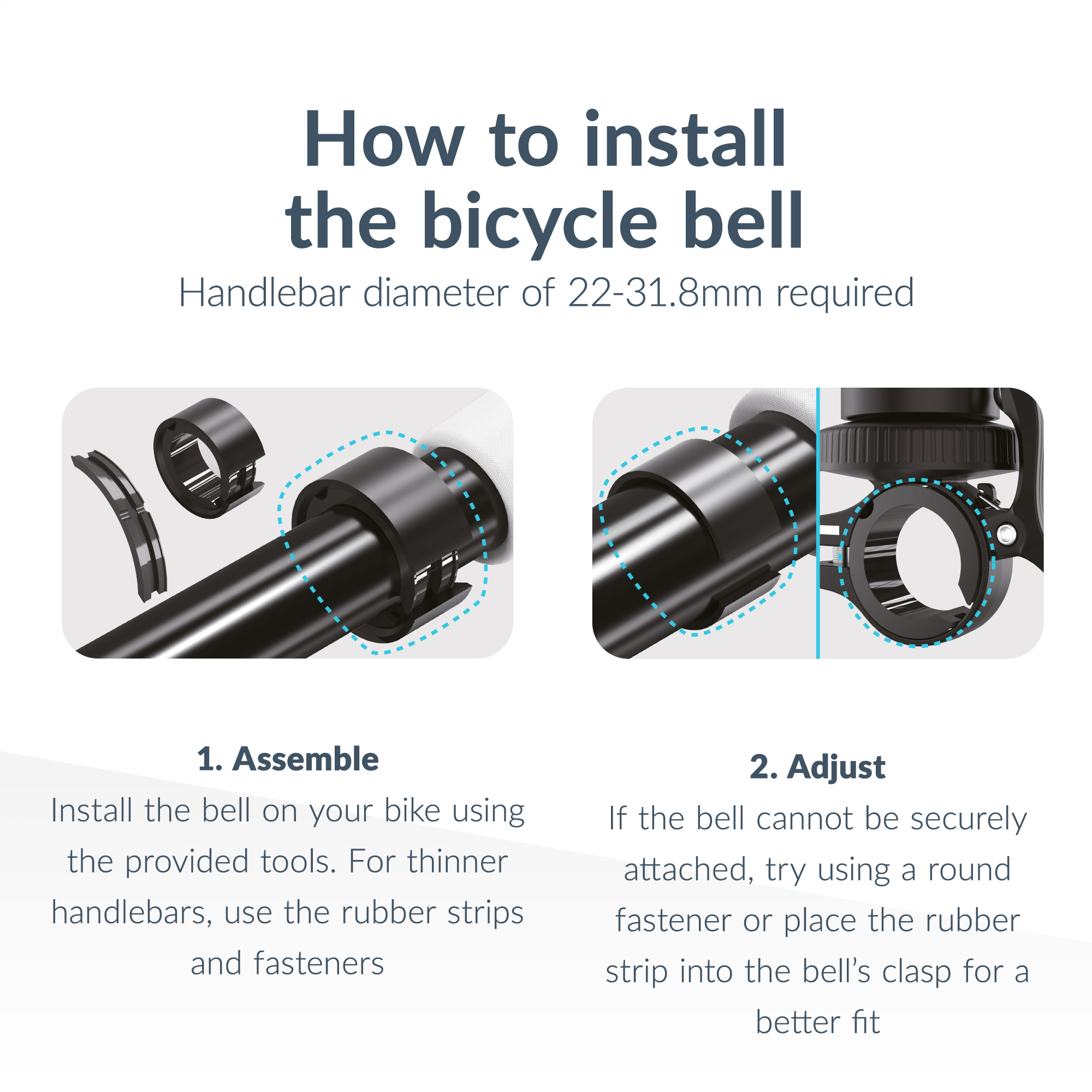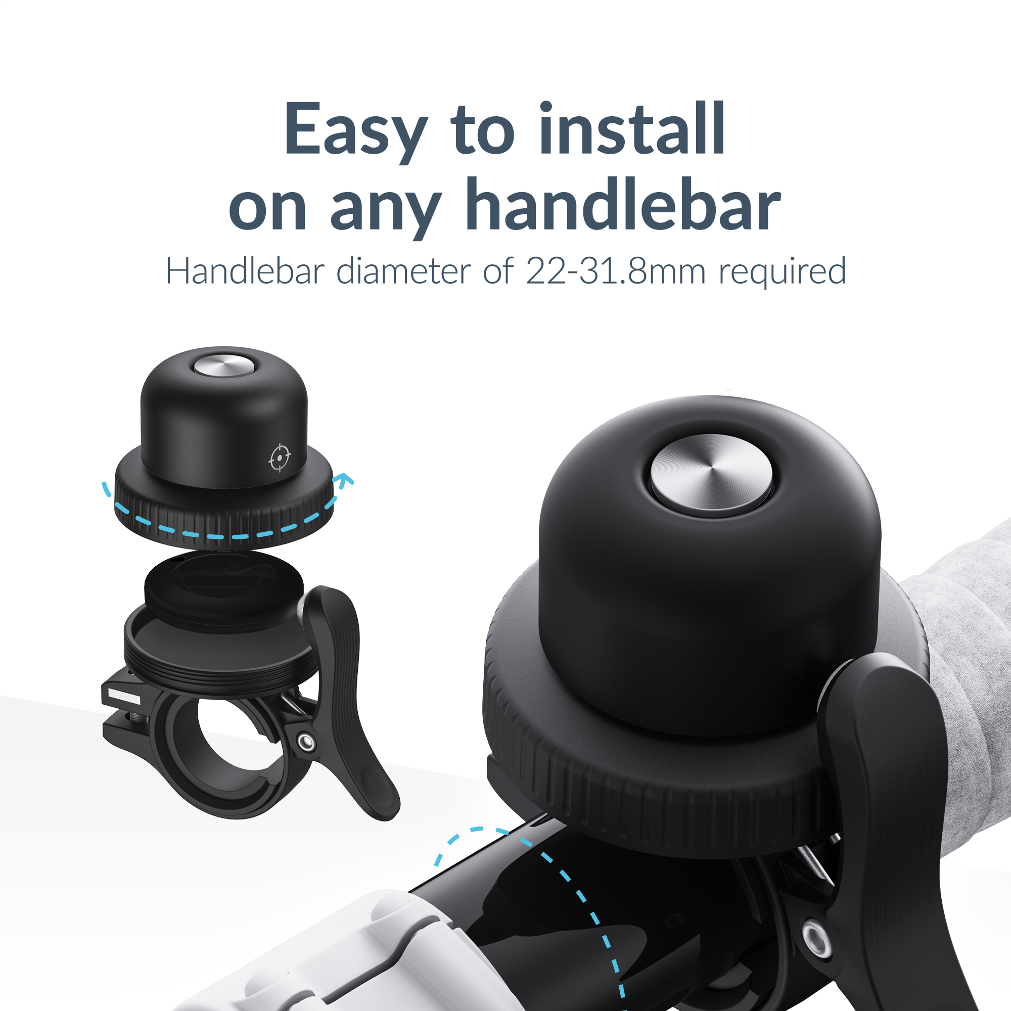 Deze fietsbel is ontworpen om op de meeste fietssturen te passen met een diameter van 22-31,8 mm. Dankzij de meegeleverde bevestigingsringen kun je de bel eenvoudig aanpassen aan verschillende fietsmodellen, zoals stadsfietsen, racefietsen, mountainbikes en e-bikes.
