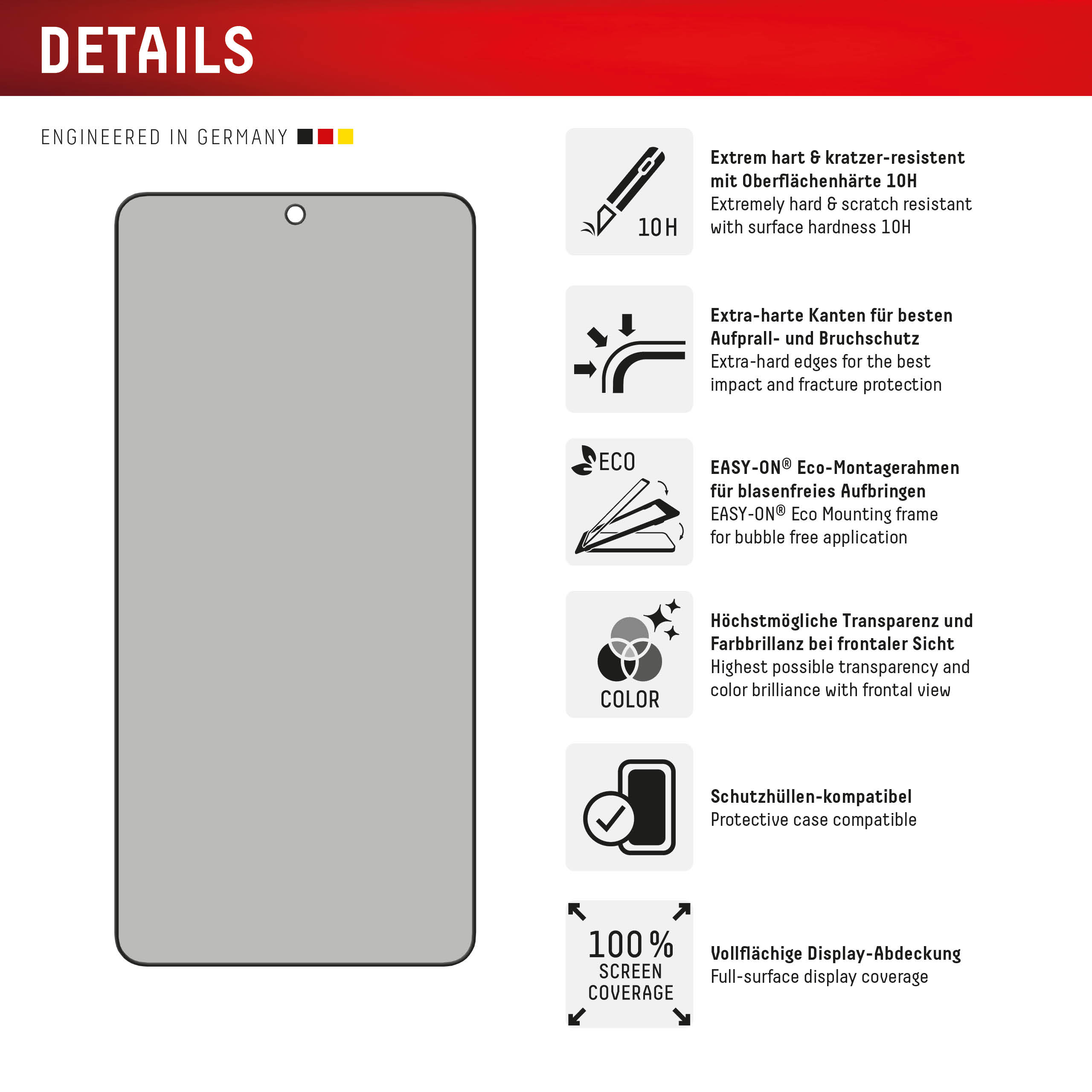 Zelfs de randen – het meest kwetsbare gedeelte van smartphone en beschermglas – zijn speciaal gehard, viervoudig gepolijst en afgewerkt met een schokabsorberende rand. Dit geavanceerde productieproces zorgt voor extra bescherming tegen stoten en schokken en maakt het gebruik van de smartphone bijzonder aangenaam. Dankzij deze eigenschappen is het beschermglas uiterst stevig en biedt het maximale breukbestendigheid.