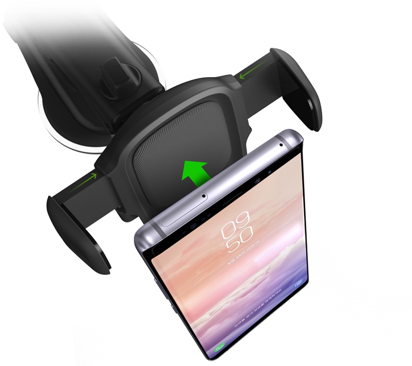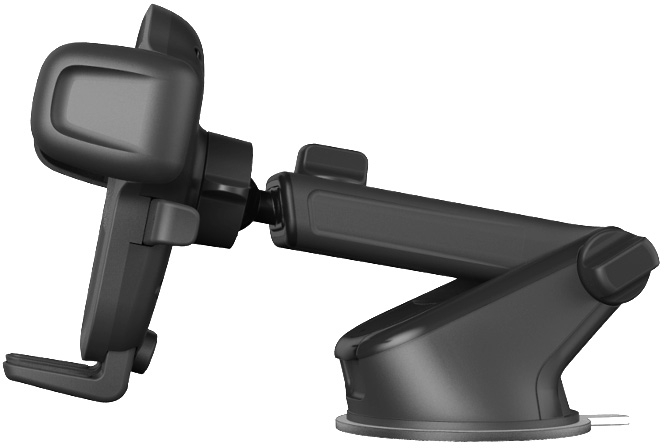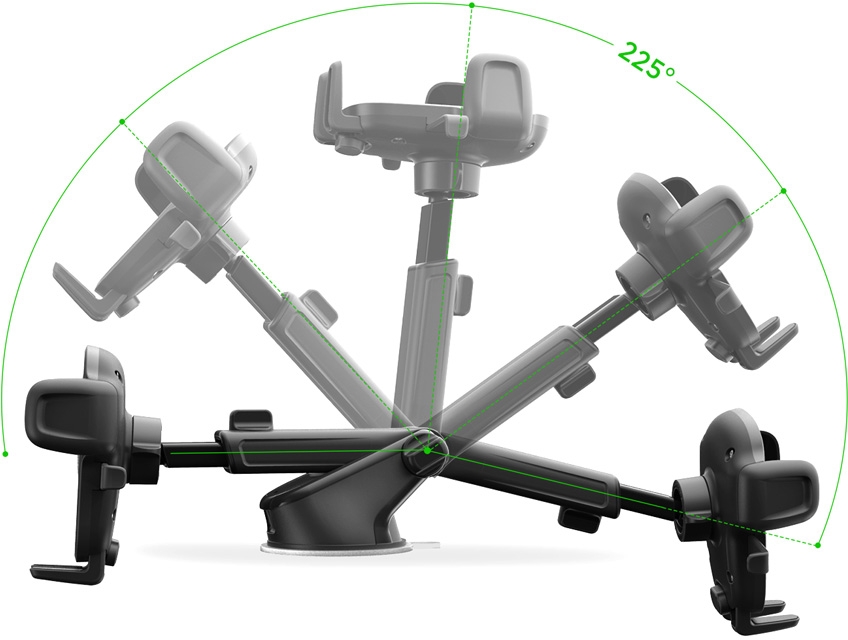 Het kogelgewricht maakt het mogelijk om de houder in bijna elke hoek te draaien en de telescopische arm zorgt ervoor dat je het toestel nog iets dichterbij kunt halen. Met een druk op 2 knoppen aan de zijkanten van de houder laten de armen het toestel los zodat je het toestel makkelijk uit de houder kunt nemen. Deze houder kan je op het dashboard of aan het raam bevestigen.