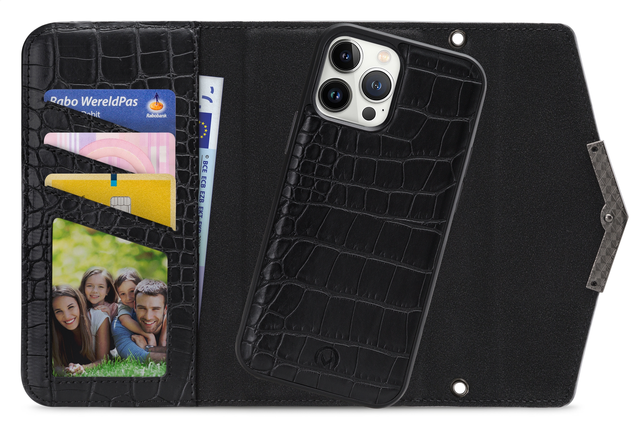 De Clutch case heeft een hoge mate van afwerking en is, door zijn samenstelling, een unieke case. De binnenkant van de wallet is gemaakt van zacht microvezel materiaal. Ook aan de binnenkant vind je 3 vakjes voor pasjes en een groter vak voor bijvoorbeeld papieren. Deze vakjes hebben een krokodilleer design wat ook terug te vinden is op de cover. Op de buitenkant zit een ruim vak voor bijvoorbeeld een sleutel.