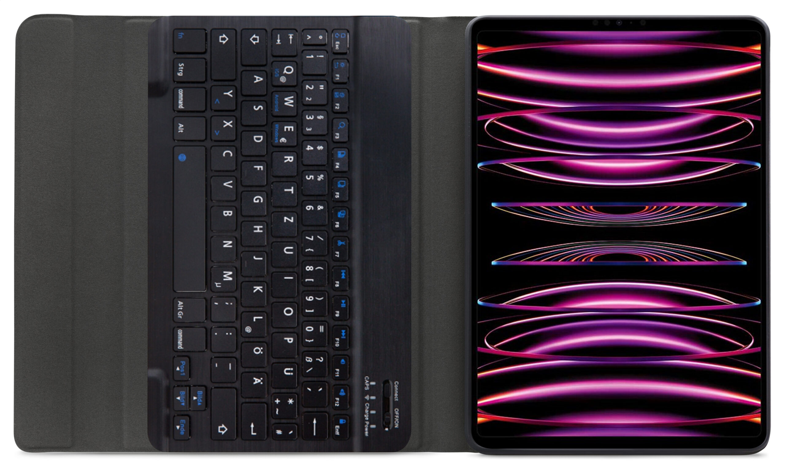 Dankzij gleuven aan de binnenkant van de case is de tablet is in 3 verschillende standen te zetten voor beter zicht op het scherm tijdens het typen van je document of Teams-vergadering. Door middel van Bluetooth maakt u verbinding met het QWERTZ-toetsenbord. Het uitneembare toetsenbord is licht van gewicht, heeft een solide bouw zodat het comfortabel typt en zit met sterke magneten stevig vast in de case. Een extra laag microfiber onder het toetsenbord zorgt er ook nog eens voor dat het niet weg zal glijden tijdens gebruik en voor extra stevigheid. In de flap van de case zit ook een sterke magneet die de gehele case netjes afsluit.