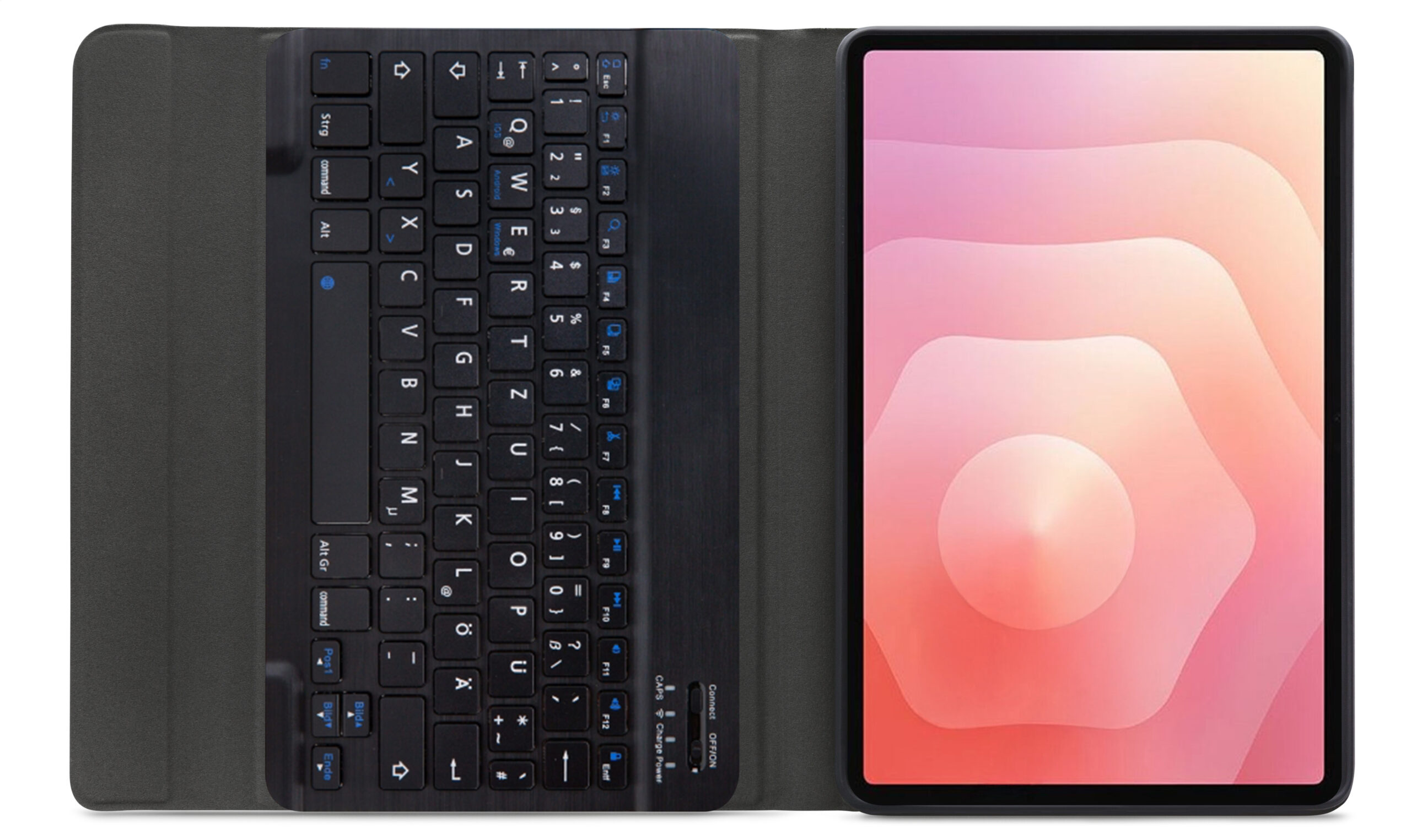 Dankzij gleuven aan de binnenkant van de case is de tablet is in 3 verschillende standen te zetten voor beter zicht op het scherm tijdens het typen van je document of Teams-vergadering. Door middel van Bluetooth maakt u verbinding met het QWERTZ-toetsenbord. Het uitneembare toetsenbord is licht van gewicht, heeft een solide bouw zodat het comfortabel typt en zit met sterke magneten stevig vast in de case. Een extra laag microfiber onder het toetsenbord zorgt er ook nog eens voor dat het niet weg zal glijden tijdens gebruik en voor extra stevigheid. In de flap van de case zit ook een sterke magneet die de gehele case netjes afsluit.