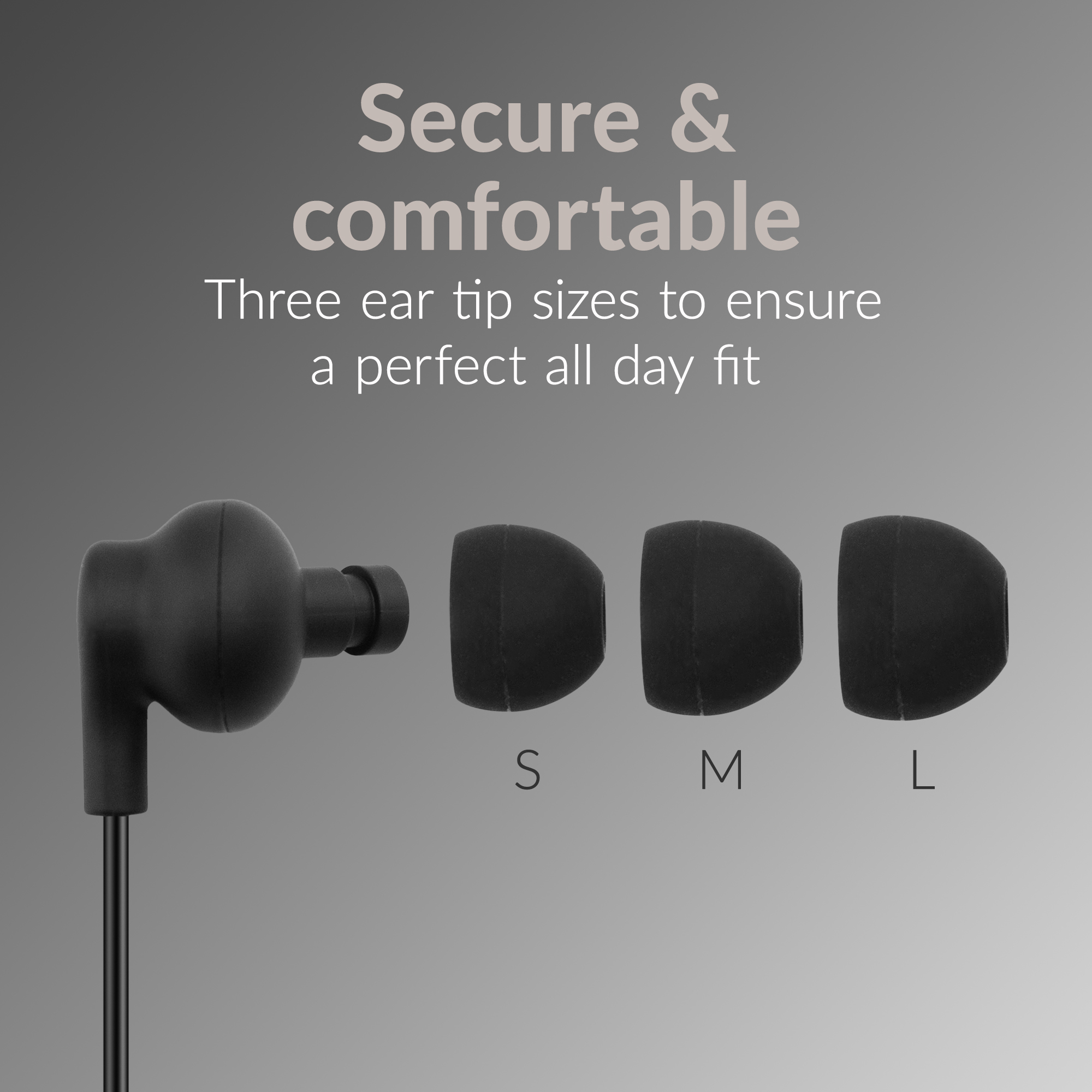 De headset wordt geleverd met drie sets siliconen eartips in verschillende maten, zodat je altijd de pasvorm vindt die het beste bij je past.