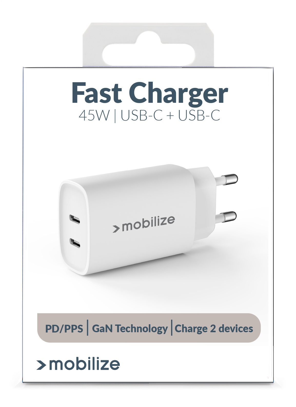 Ontmoet de Mobilize Wall Charger, jouw nieuwe, USB-C lader voor het stopcontact. Met twee USB-C poorten en een totaal vermogen van 45W, is deze lader een krachtig accessoire voor al je apparaten. Deze slimme en veilige lader maakt gebruik van PD/PPS technologie, waarmee je jouw apparaat in minder dan 30 minuten van 0% naar 50% kunt opladen.