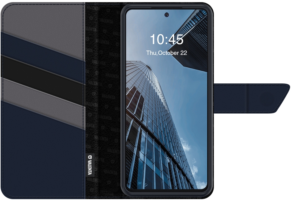 Uit de SNAP*series van Valenta is deze Universele leren magnetische Book Case, oftewel een Universele Book Cover Omslag, een eigentijdse telefoonomslag speciaal gemaakt om te combineren met een Back Cover SNAP*. De SNAP* Back Cover bestel je er los bij dus je kunt mix & match-en met elke kleur die jij wilt. Deze universele magnetische book case omslag is verkrijgbaar in 2 maten; Medium & Large, waardoor deze voor meerdere modellen & merken telefoons gebruikt kan worden. Deze telefoonhoes heeft geen camera opening, waardoor de cameralens beter beschermt blijft tegen krassen en stof. Deze luxe case omslag is vervaardigd uit 3 kleuren leder. De buitenkant is zwart leer en aan de binnenkant zijn de vier kaartsleuven van het blauwe en grijze leer uit de SNAP*series gemaakt. Er is een groot vak voor papiergeld en een magneetsluiting aan de voorkant om de SNAP* Book Case helemaal af te sluiten. De luxe Book Case Snap is tot in de kleinste details afgewerkt, zodat het perfect past binnen het Mix & Match concept van de Valenta SNAP*series.