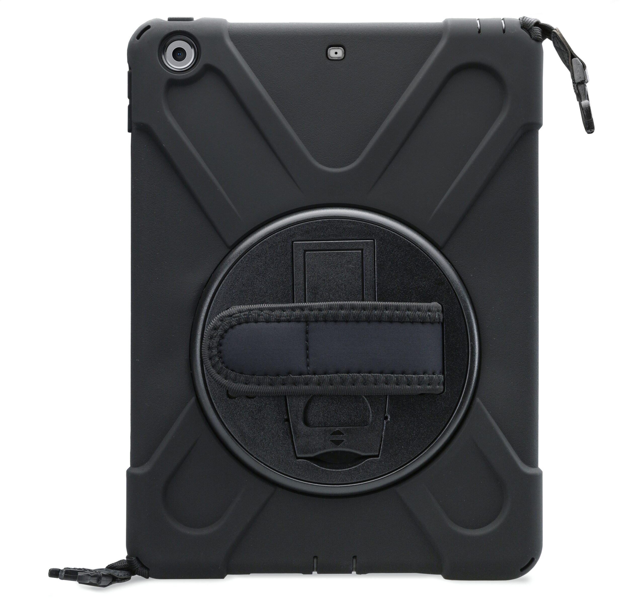 Met de Xccess Rotating Survivor Case bent u van alle gemakken voorzien. De case is gemaakt uit een basis van hard plastic, met een rubberen afwerking. Zo vangt de case eventuele klappen en stoten op als de tablet per ongeluk valt. Gelukkig zal dit niet snel gebeuren, dankzij de Hand Strap op de achterzijde. Deze strap zorgt ervoor dat u de tablet goed vast kunt houden. Middels het klittenband is de strap goed strak te trekken om elke hand. Deze strap bevindt zich op een 360° draaibare schijf, zodat u de tablet in zowel landscape als portrait stand wilt gebruiken. Daarnaast kunt u de tablet als schoudertas dragen dankzij het bijgeleverde koord. Achter de Hand Strap is bovendien nog een handige standaard te vinden, zodat u comfortabel naar video's kunt kijken.